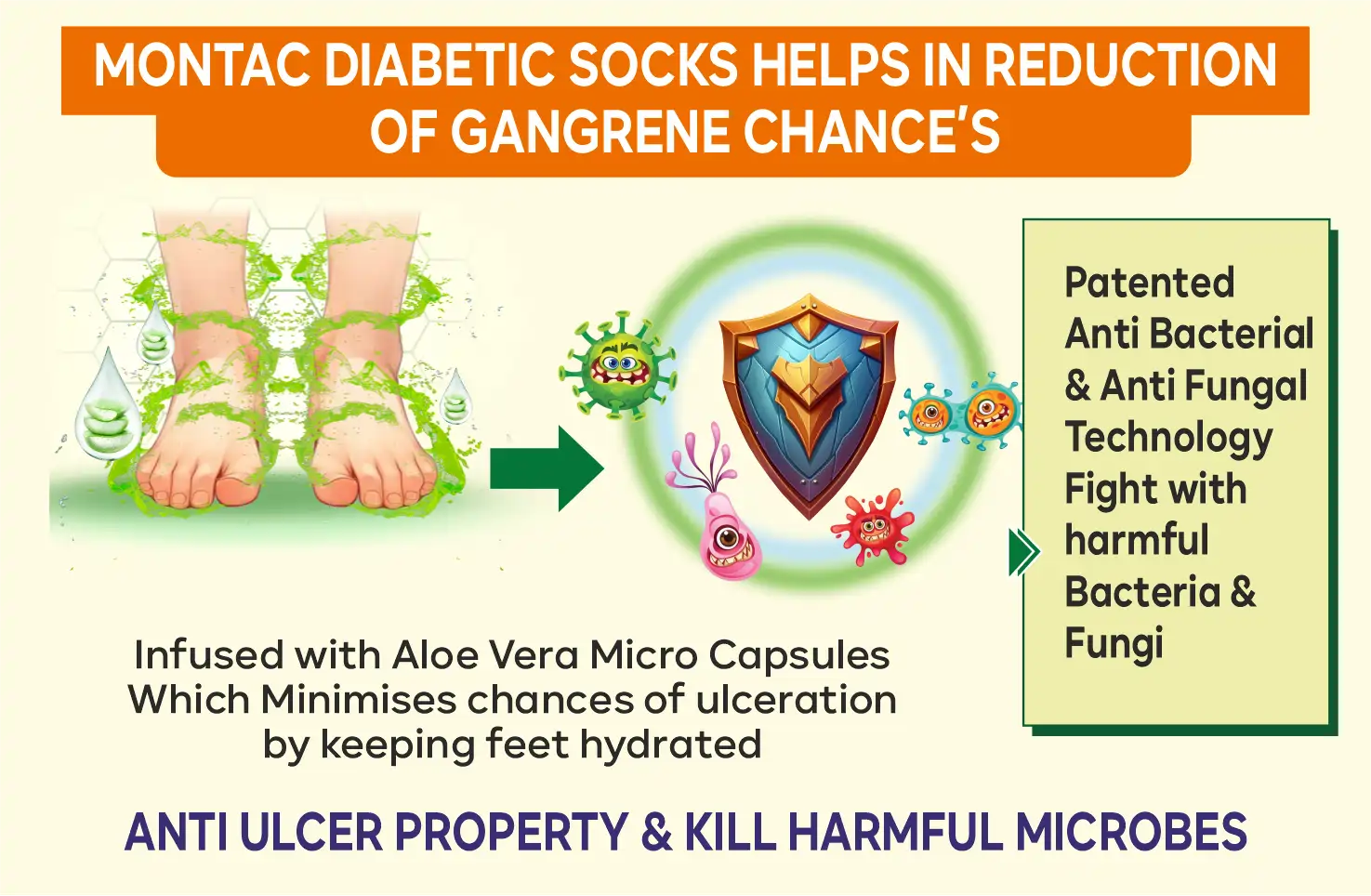 गँग्रीनची शक्यता कमी करण्यास मदत करते- उत्कृष्ट कोरफडीचे मायक्रो एन-कॅप्सूलमध्ये रूपांतरित केले गेले आहे, जे या सॉक्समध्ये घातले जाते. चालताना घर्षण झाल्यामुळे हे कॅप्सूल फुटतात. यामुळे पाय हायड्रेटेड राहून अल्सर होण्याची शक्यता कमी होते. अद्वितीय पेटंट केलेले अँटी-बॅक्टेरियल आणि अँटी-फंगल गुणधर्म हानिकारक बॅक्टेरिया आणि बुरशीशी लढतात.