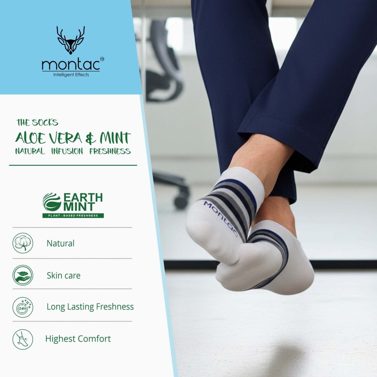 Crafted from a premium Cotton Lycra blend, these socks are infused with the natural goodness of Aloe Vera and Mint, offering unmatched comfort, skin nourishment, and all-day freshness.
