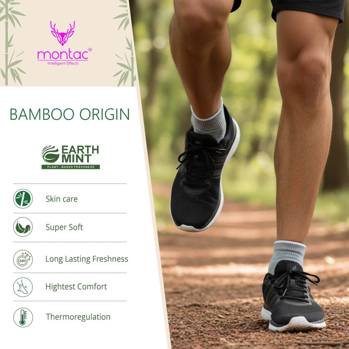 Introducing Montac Bamboo Origin Socks, a premium nature-based comfort solution designed for everyday wear. Bamboo Origin Socks are crafted using the finest quality bamboo yarn that delivers luxurious softness, breathability, and long-lasting comfort. Infused with natural mint freshness, Bamboo Origin Socks help keep your feet cool, hygienic, and odour-free throughout the day. The advanced thermoregulating properties ensure that Bamboo Origin Socks adapt to different temperatures, making them perfect for every season. Choose Bamboo Origin Socks for a superior, eco-friendly, skin-friendly & long-lasting foot care experience — where sustainability meets luxury.