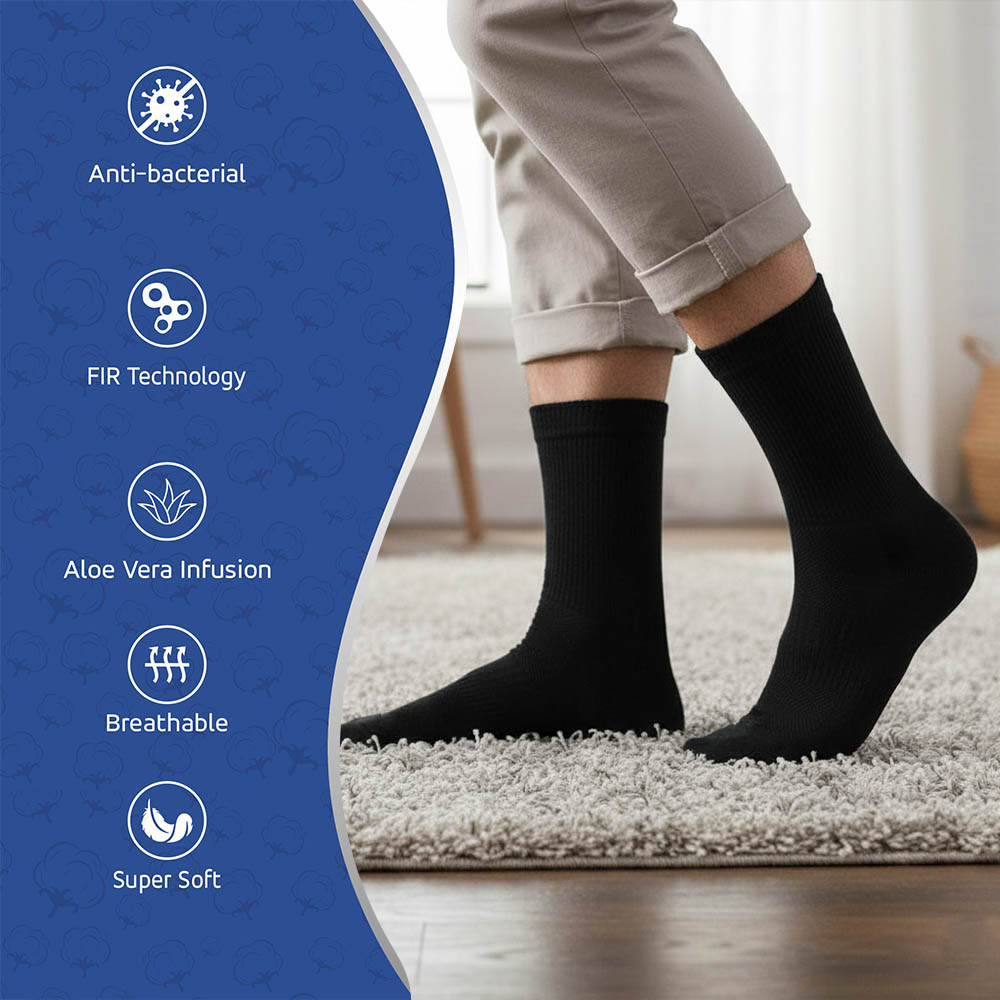 The finest of Aloe-Vera extracts has been converted into micro en-capsules that are infused into these socks. These capsules burst due to friction in times of walking, which minimises the chances of ulceration by keeping the feet hydrated. A unique patented Anti-Bacterial & Anti-Fungal Property fights with harmful bacteria and fungi. Combined effect of Anti-Ulcer and Anti-microbial property helps in reduction of gangrene chances. Patent No – 429234