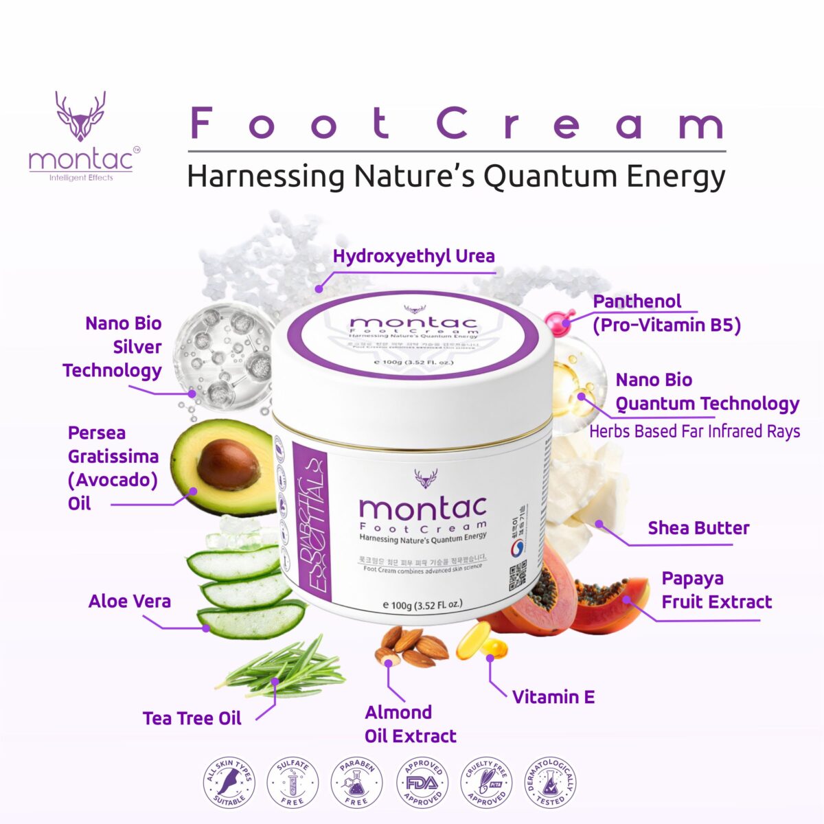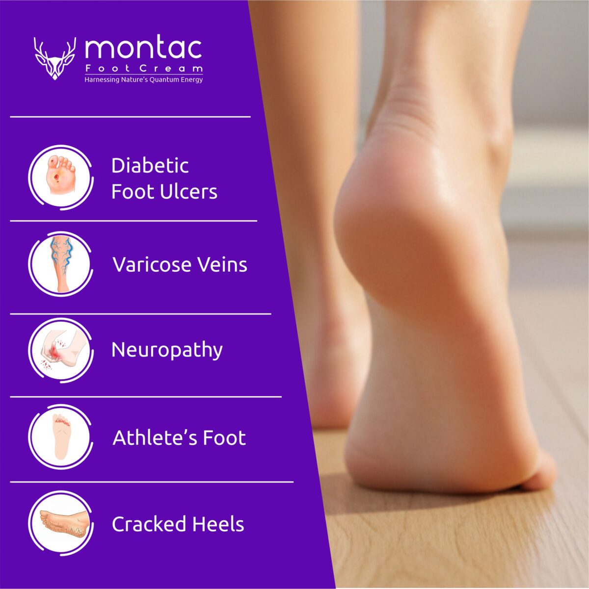 Montac Foot Cream is a clinical-grade, all-in-one therapeutic foot care solution developed by Montac Lifestyle to support dry, damaged, and chronically stressed feet. Designed to go beyond surface moisturization, its advanced bio-active formula works at deeper skin levels to restore comfort, protection, and long-term skin health. Powered by Herbal Far-Infrared (FIR) Technology and Nano Bio Silver, the cream creates a Smart Healing Environment that supports skin repair while helping maintain hygiene and protection. The herbal FIR technology emits gentle biogenic energy that helps stimulate micro-circulation, improve oxygen delivery, and open skin micro-channels—allowing active ingredients to absorb more effectively and work faster. At the cellular level, the FIR energy supports natural metabolic activity, helping stressed, thickened, and cracked skin recover and maintain healthy integrity. Nano Bio Silver provides broad-spectrum antifungal and antibacterial protection, helping keep feet fresh, clean, and protected from microbial stress. With regular use, Montac Foot Cream helps improve skin texture, hydration, and resilience, making it especially suitable for diabetic and sensitive feet. When paired with Montac Diabetic Socks, it forms an occlusive shield that helps lock in active ingredients and supports up to 2× faster visible improvement compared to regular creams.